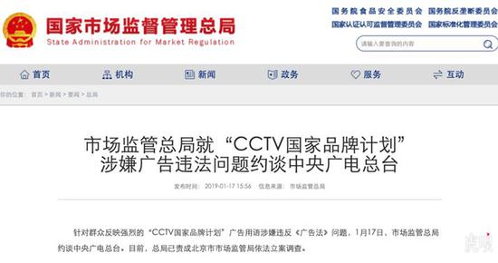 2019年1月17日,國家市場(chǎng)監(jiān)督管理總局針對(duì)“CCTV國家品牌計(jì)劃”廣告用語涉嫌違反《廣告法》問題約談中央廣電總臺(tái),并責(zé)成北京市市場(chǎng)監(jiān)管局依法立案調(diào)查。