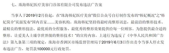 2019年,珠海韓妃醫(yī)療美容門診部有限公司發(fā)布包含“國內(nèi)首家”、“最前沿的整形技術(shù)、最精良的整形技法、最優(yōu)秀的整形效果”、“世界級(jí)的整形技術(shù)”的宣傳內(nèi)容,被罰款10萬元。