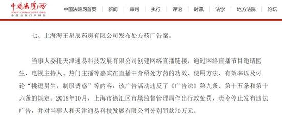 2018年6月15日,上海海王星辰藥房有限公司因開展“有球必硬夜夜激情”網(wǎng)絡(luò)直播活動(dòng),被依法處罰款70萬元。