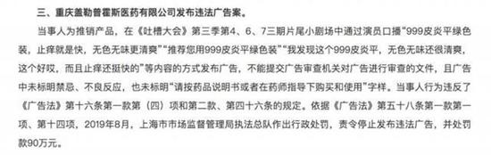 2019年12月17日,999皮炎平因在《吐槽大會(huì)》第三季第4、6、7三期片尾小劇場(chǎng)中通過演員口播廣告,但未標(biāo)明禁忌、不良反應(yīng),也未標(biāo)明“請(qǐng)按藥品說明書或者在藥師指導(dǎo)下購買和使用”字樣,被罰款90萬元。